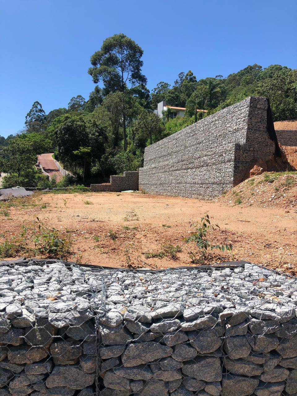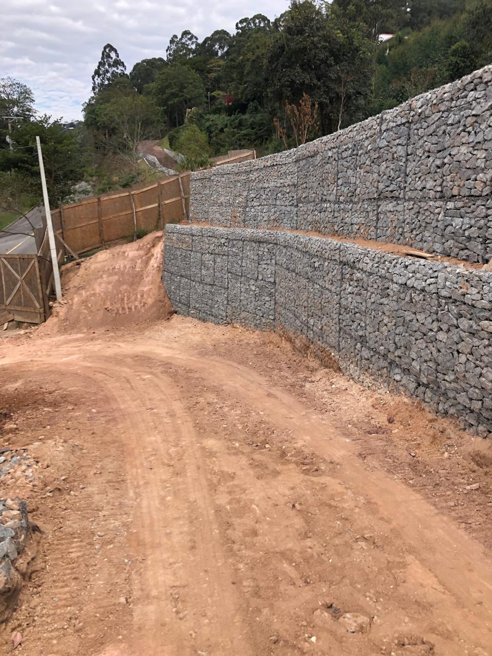 Estrutura metálica flexível e vazada, preenchida com pedras, utilizada para contenção de solo, estabilização de taludes e controle de erosão.